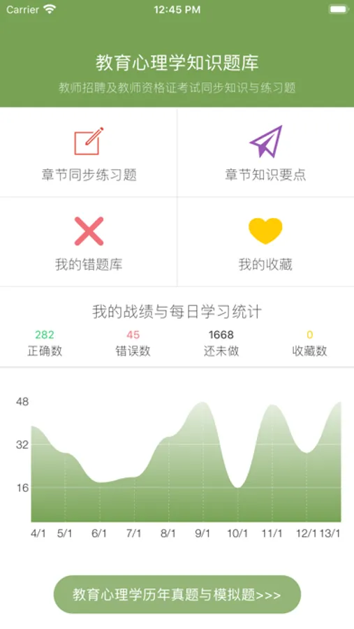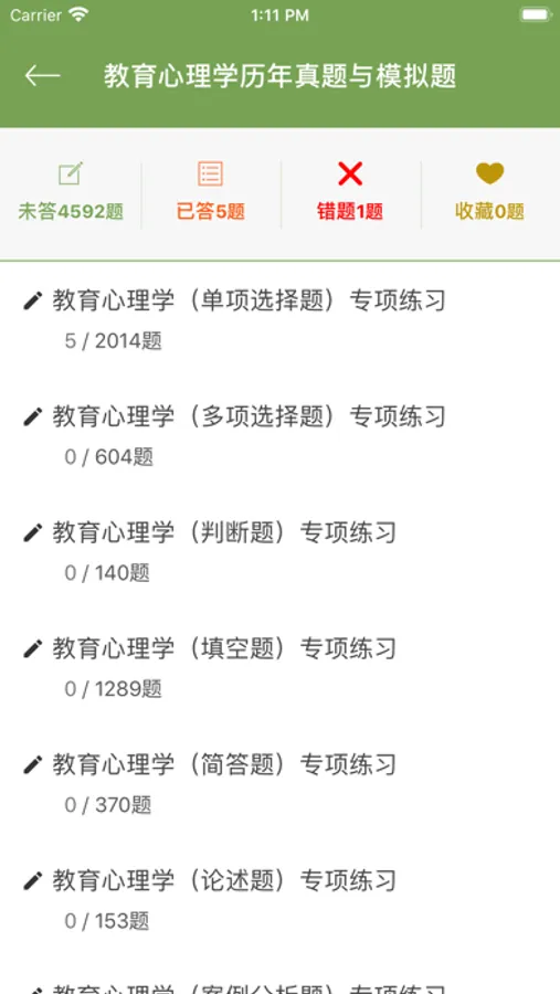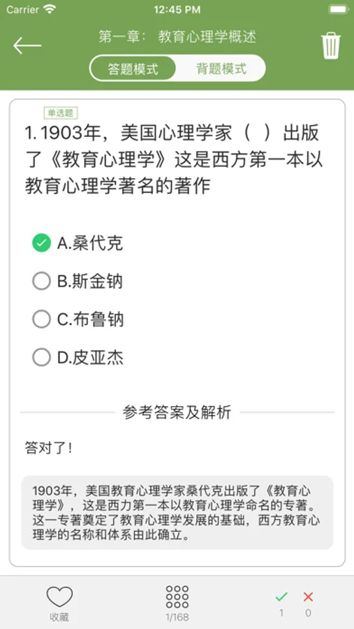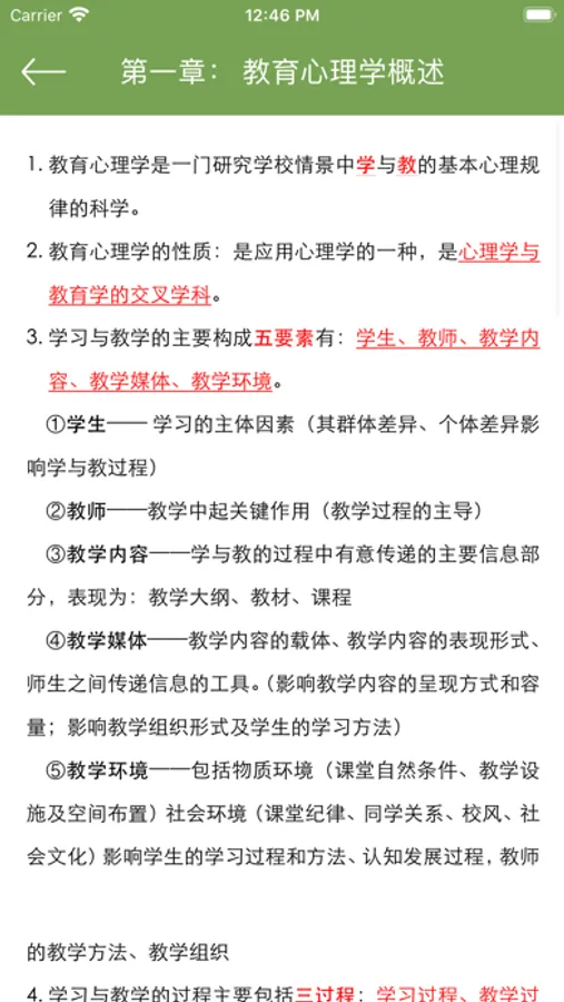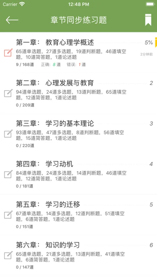 一、教育心理学章节同步练习题库及章节同步知识要点:模块清晰,有答题与背题两种模式,每道题通过卡片显示、试题目录,漂亮美观。 可以点击加入收藏、有答错提示、查看每题对错一目了然、清空重做本份章节、做题进度与时间、阅读进度、书签等功能。