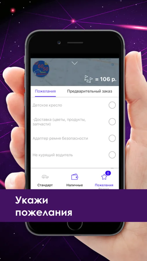 Укажите необходимые пожелания перед заказом (детское кресло, доставка цветов, продуктов и запчастей, адаптер ремня безопасности, некурящий водитель).
