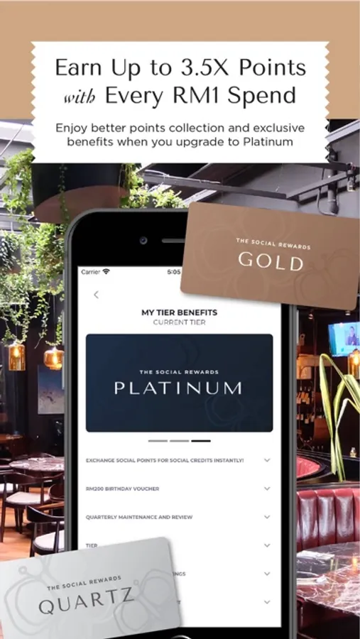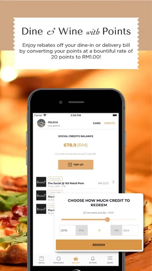 The Social Rewards App is an easy-to-use digital loyalty platform for members to earn points, get instant rebates, enjoy exclusive promotions and easily order food deliveries across its bar, café and restaurant brands. It provides quick overview of members' credits and points status, enabling redemptions of vouchers and gifts, as well as, seasonally rewarding members for checking in daily.