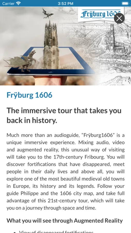 Much more than an audioguide, "Frÿburg1606" is a unique immersive experience. Mixing audio, video and augmented reality, this unusual way of visiting will take you to the 17th-century Fribourg. You will discover fortifications that have disappeared, meet people in their daily lives and above all, you will explore one of the most beautiful medieval old towns in Europe, its history and its legends. Follow your guide Philippe and the 1606 city map, and take full advantage of this 21st-century tour, which will take you on a journey through space and time.