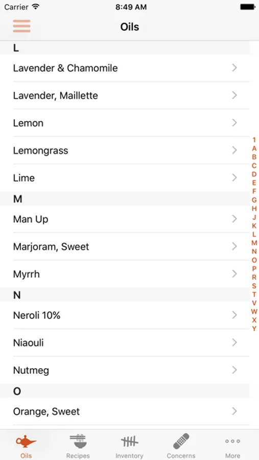 > Lists oils including the following information on each: