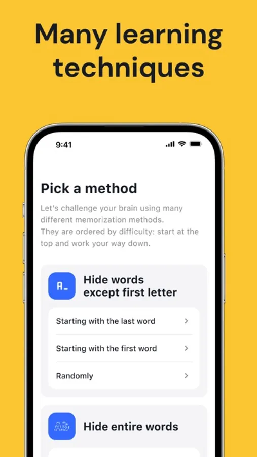 • More than 10 different methods of memorization, to train your brain in various ways and increase retention.