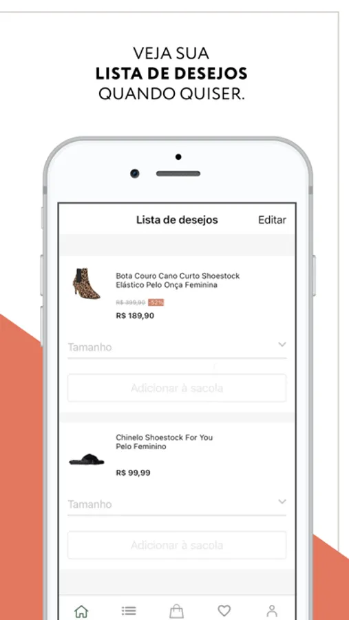 Buscamos sempre oferecer a melhor experiência de compra da internet. No aplicativo, você pode facilmente escolher seus novos sapatos, bolsas e acessórios de acordo com as categorias de produtos, de maneira prática e rápida.