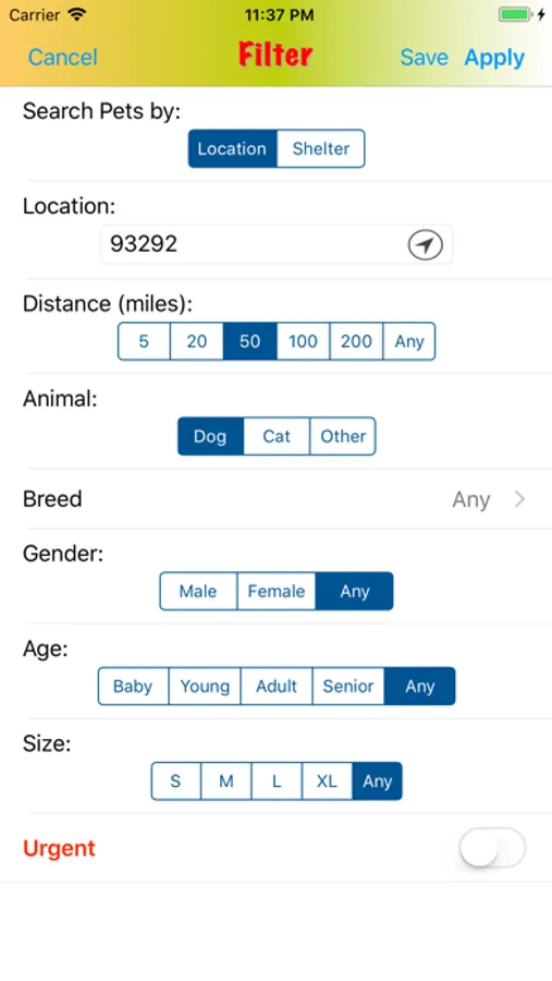 • Narrow your search down even further by searching for pets that are Urgent. Urgent pets have been assigned euthanasia dates and don’t have much time so they are in desperate need of a loving home ASAP!!!