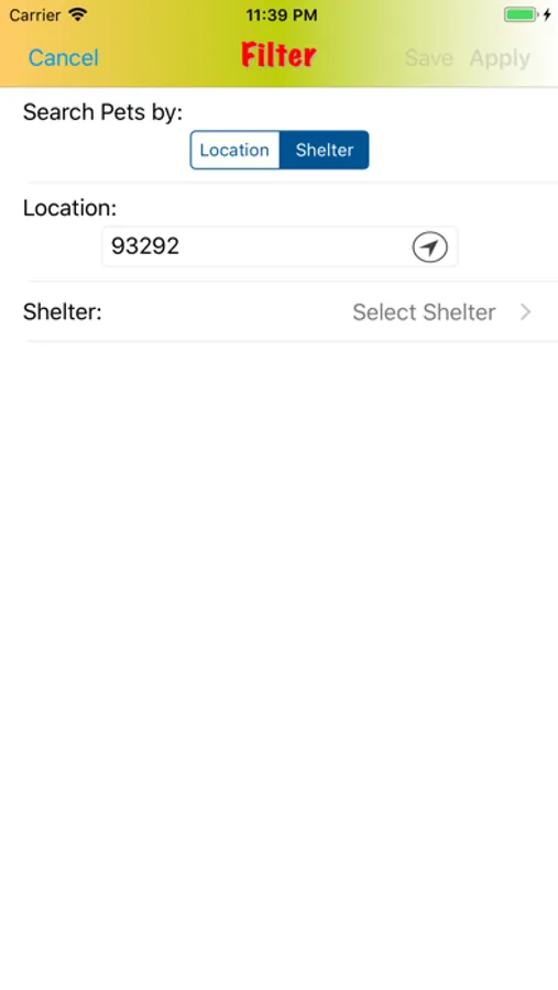 • Use the Search Filter to search for pets by zip code or animal shelter.