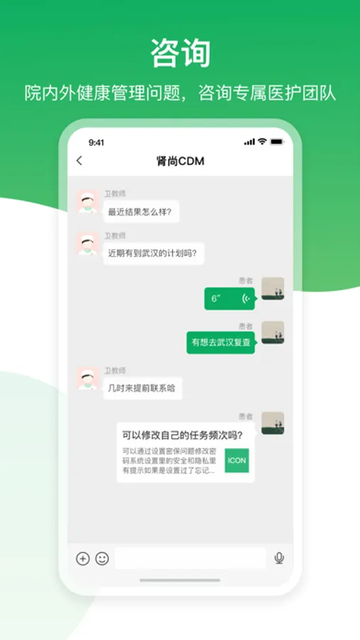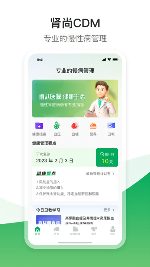 使用肾尚CDM,用户可直接获得其医院主管医护团队的辅导,正确开展用户自我慢病管理。使用肾尚CDM,用户可记录和跟踪对于慢性病患者非常重要的健康管理行为,例如日常锻炼、饮食、血压、血糖或用药记录等。 用户记录的数据将安全地传递给用户所属的专科主治医师及其医护团队,他们将结合用户的其它体检记录、门诊记录等医疗数据,对用户的日常数据进行分析评估,并向用户提出最合适其自身状况的健康管理活动内容、要求及其注意事项等。