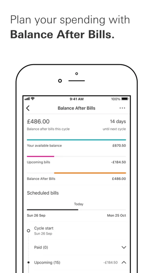 Balance After Bills helps you plan your finances from one payday to the next. It shows you how much you could have left for the month ahead, once scheduled bills like standing orders, Direct Debits, credit cards, loans and mortgages are taken into account.