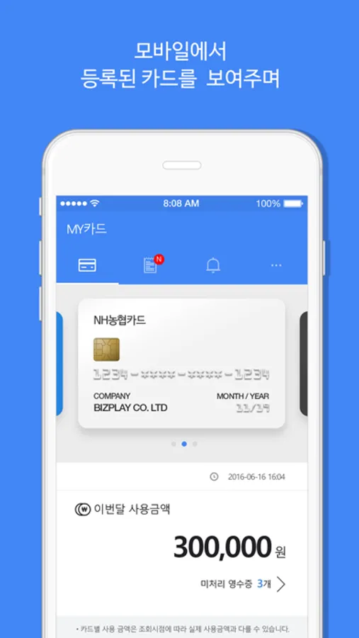 * NH소호비즈(모바일) 실행하면 PC에서 등록한 카드를 확인 할 수 있습니다.