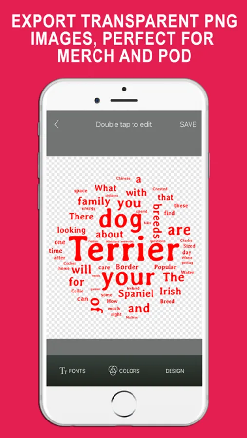 CREATE T-SHIRT DESIGNS: This app creates word cloud designs up to 4500 x 5400 pixels, suitable for Merch by Amazon, Teespring, Redbubble and other platforms