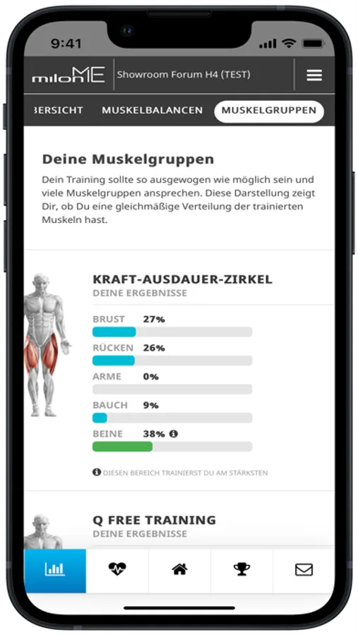 But that's not all: with milon ME you can also keep an eye on your muscle groups and make sure you train in a balanced way. For an extra motivational boost, there's also the option to compare your training performance with others.