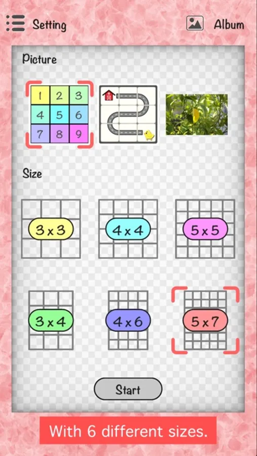 Create and enjoy sliding puzzle with your pictures with 6 different size.