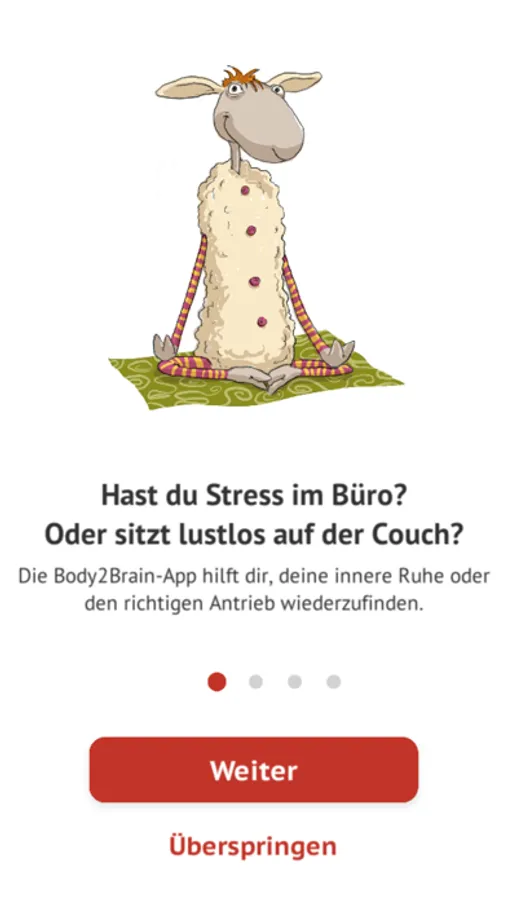 Die Body2Brain-App bietet dir 15 Übungen für Entspannung und die richtige Energie im Alltag. Wähle einfach deine momentane Stimmung und Umgebung aus und die passende Übung wird für dich ausgewählt.