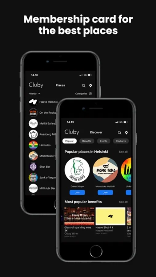 Cluby is a membership card for the best places in your city - such as bars, cafes, restaurants, nightclubs and barber shops.
