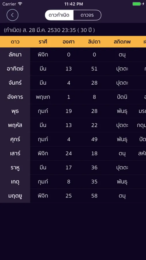 • แตะที่ดาวจรเพื่อดูวันที่ดาวย้ายราศีได้