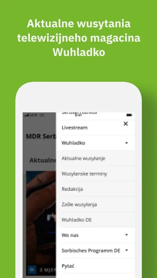 Die App bietet einen für die mobile Nutzung optimierten Zugang zu den Inhalten des sorbischen Programms. Man hat direkten Zugriff auf die Internetangebote von SERBSKI ROZHŁÓS und WUHLADKO.