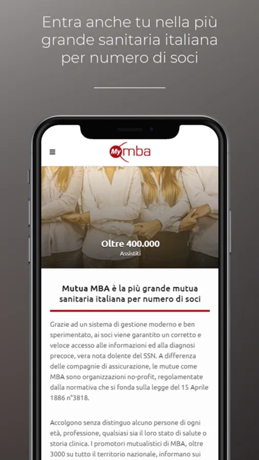 Entra anche tu nel mondo di Mutua MBA, la più grande mutua sanitaria italiana per numero di soci. Con MyMBA potrai essere sempre aggiornato sulle ultime novità della sanità integrativa e poter controllare tutte le tue pratiche ovunque tu sia. È possibile accedere a tutti i servizi legati alla tua posizione o sussidio direttamente dal tuo smartphone.