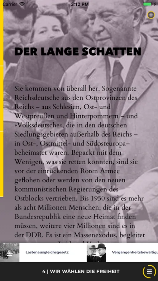 Vier Epochen prägten die Biografie von Konrad Adenauer: das Kaiserreich, die Weimar Republik, das Dritte Reich und die junge Bundesrepublik. 1933 von den Nationalsozialisten als Oberbürgermeister von Köln abgesetzt, begann er 1945 seine zweite politische Karriere. Mit der ersten Bundestagswahl wurde er im September 1949 zum „Gründungskanzler“.