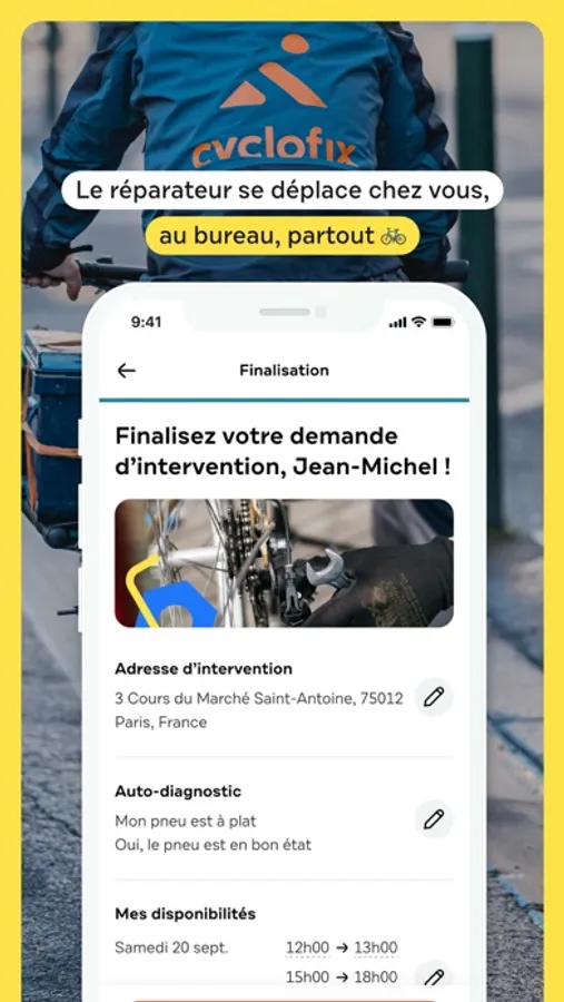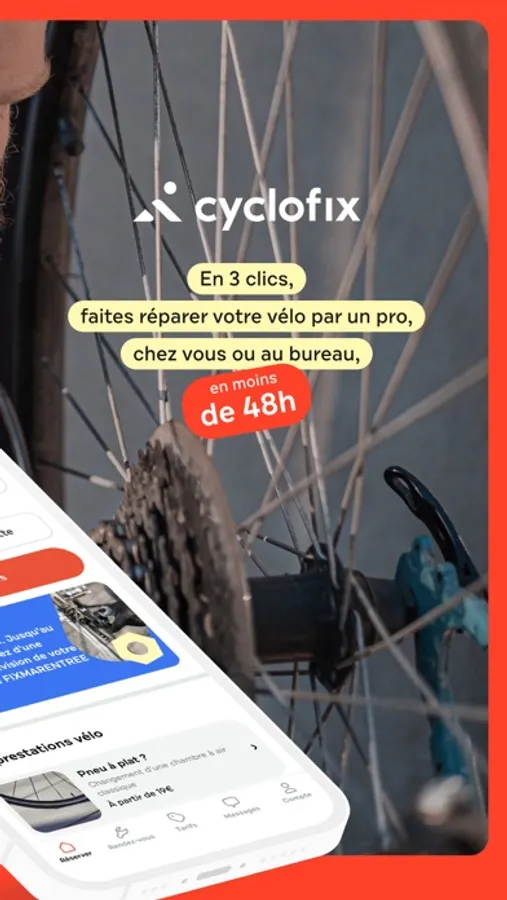 Avec l’application Cyclofix, prenez RDV depuis n’importe où, à n’importe quel moment, en quelques minutes seulement. Votre roue est voilée ? Dégainez votre smartphone dans la rue, en attendant votre café ou devant votre série, et prenez RDV pour une intervention dans les 48h !