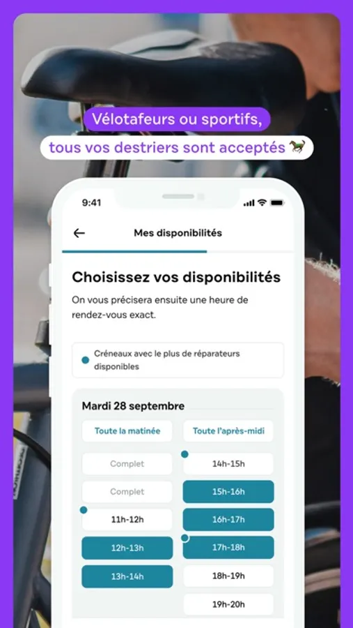Fini les files d’attente en magasin ou en atelier. Avec Cyclofix, vous avez la main sur la date et l’heure de RDV. Renseignez vos dispos des prochains jours directement sur l’app, on vous proposera un RDV avec un mécanicien vélo dans les 48h !