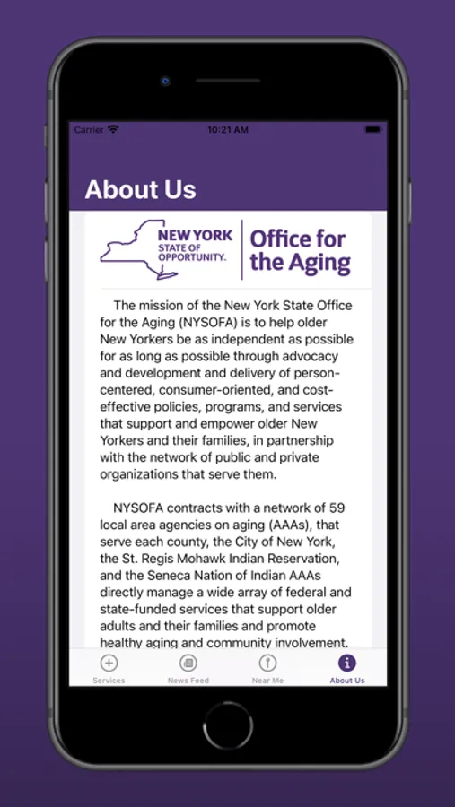 NYSOFA contracts with a network of 59 local area agencies on aging (AAAs) that serve each county, the City of New York, the St. Regis Mohawk Indian Reservation, and the Seneca Nation of Indians. AAAs directly manage a wide array of federal and state-funded services that support older adults and their families and promote healthy aging and community involvement.