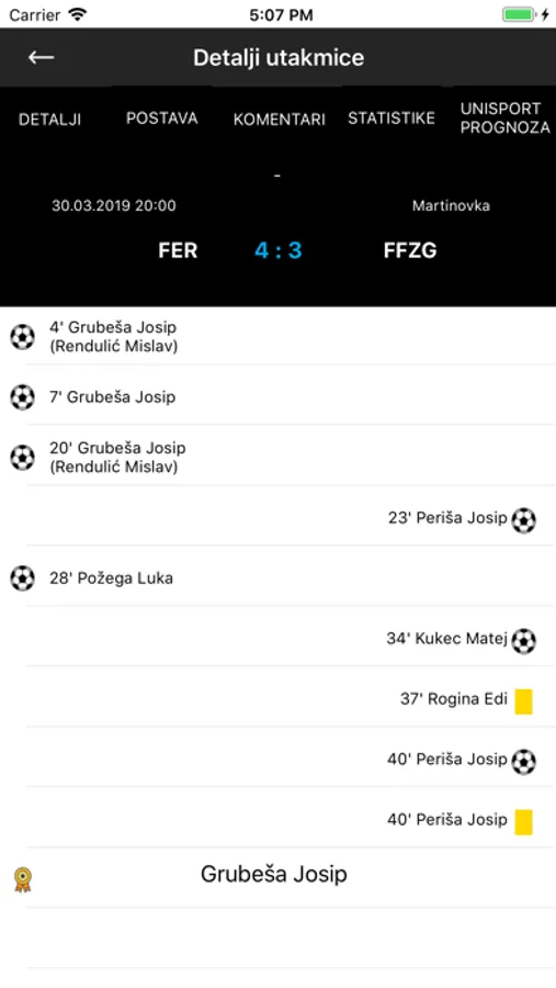 - Detalji utakmica - pregled svih detalja utakmica i postave momčadi