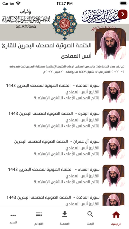 أول تطبيق يعنى بكل ما يتعلق بقراء القرآن الكريم بمملكة البحرين مِن تسجيلات صوتية ذات جودة عالية ومعلومات عن أبرز القراء.