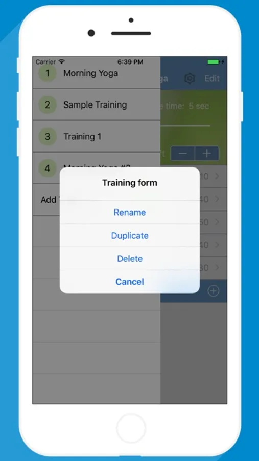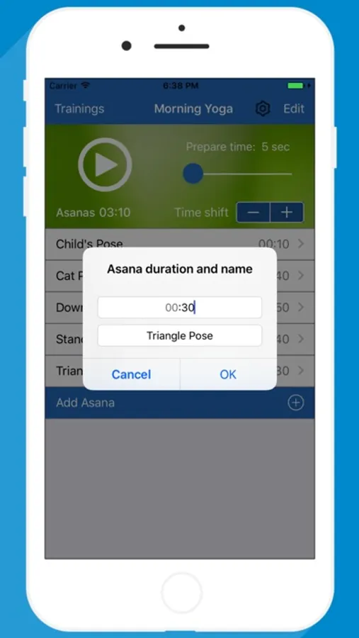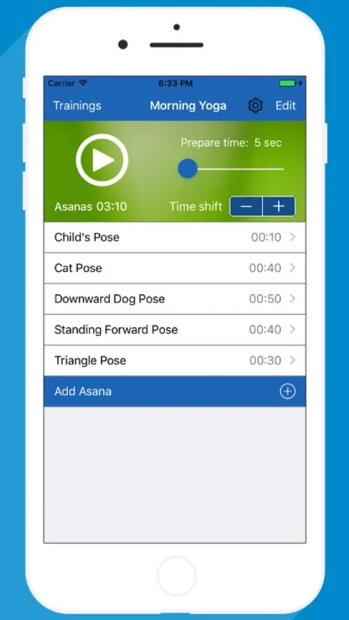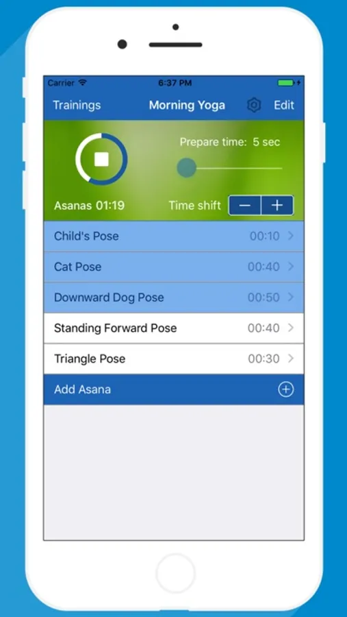 You can easily make unlimited yoga trainings and save them. Each training consists of a number of asanas with duration times.