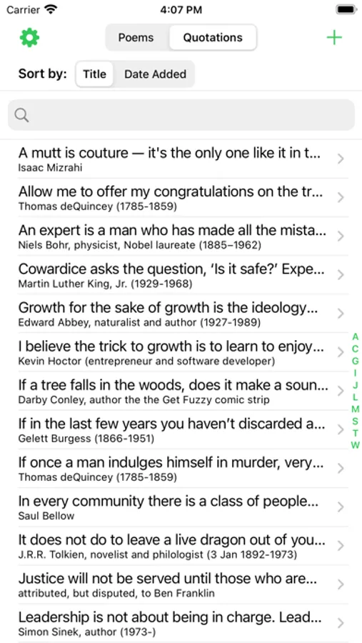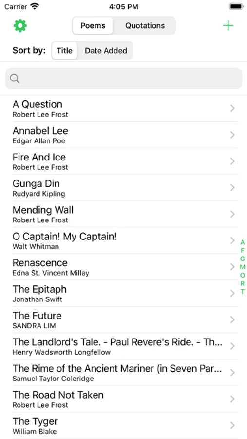 Poets Corner is your personal anthology of favorite poems, lyrics and quotations. Poems and lyrics are indexed by title and author; quotations are indexed by the first few words of the quotation and the author. But you can find items using a full-text search.