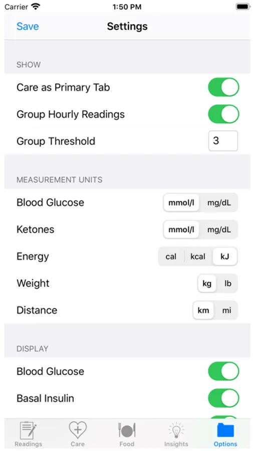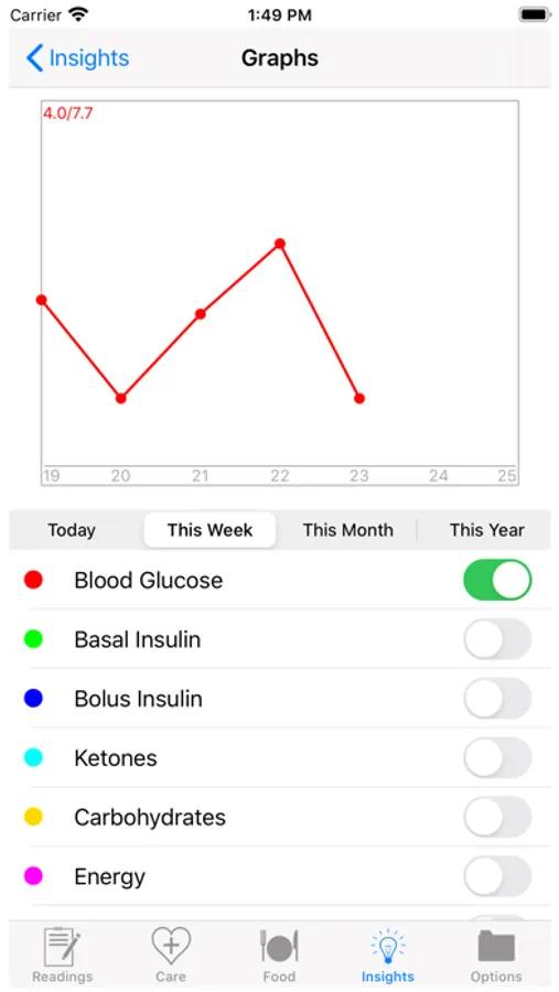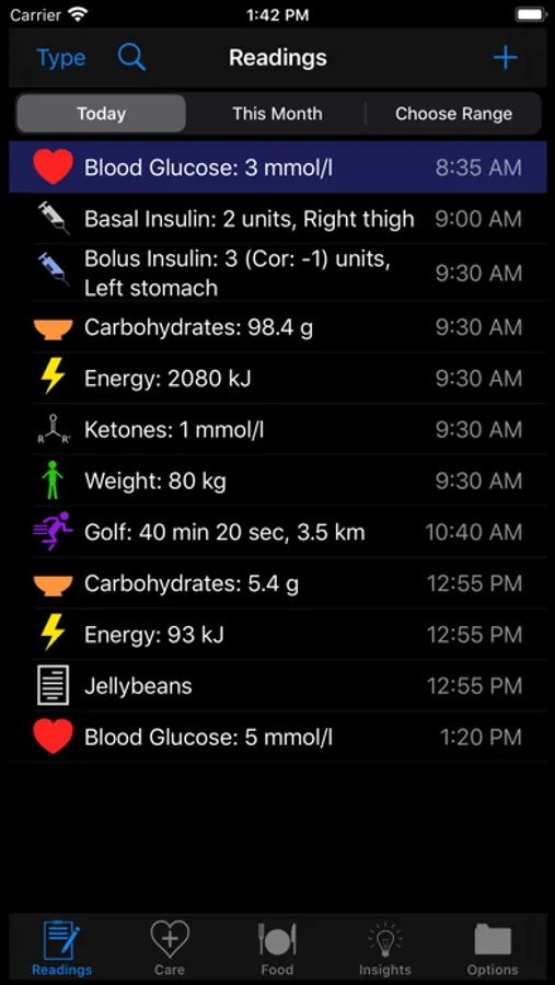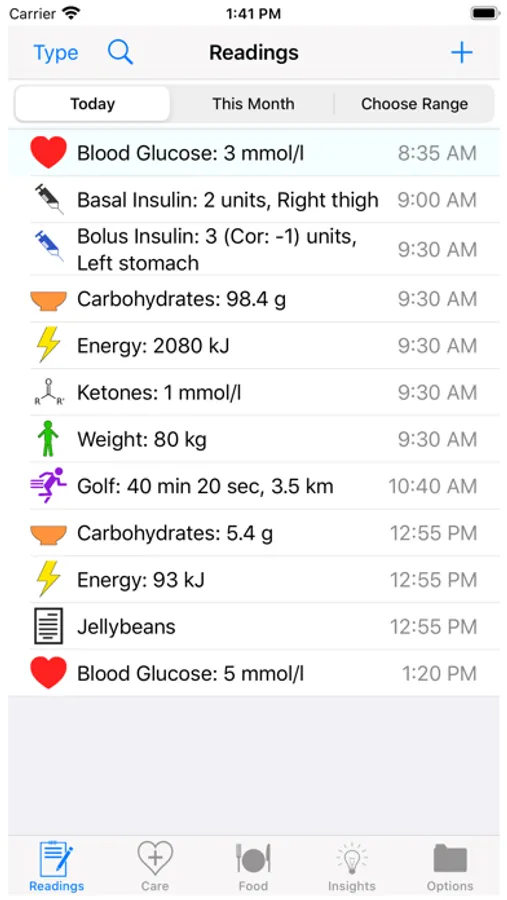 The Readings screen lets you see your condition over various periods of time and can summarise multiple readings of the same type into a single hourly record for ease of viewing. Blood Glucose reading backgrounds are colour coded to make low and high readings easily visible.