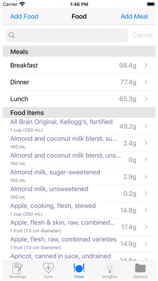 A vital part of managing your blood glucose is the recording of the carbohydrates you eat. The application includes a database of common foods along with their nutrition information. In addition you can add any food or meals that you commonly eat that are not included. This information can be used to track food intake along with the corresponding carbohydrates and energy. This helps you when working out how much insulin to take.