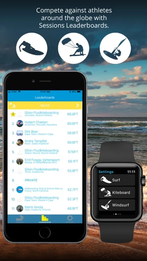 - Compete with surfers, kiters and sailors around the world for the longest wave, highest jump, best airtime, fastest run, distance in session, fastest wave and most waves per session (depending on your sport) with Sessions Leaderboards!