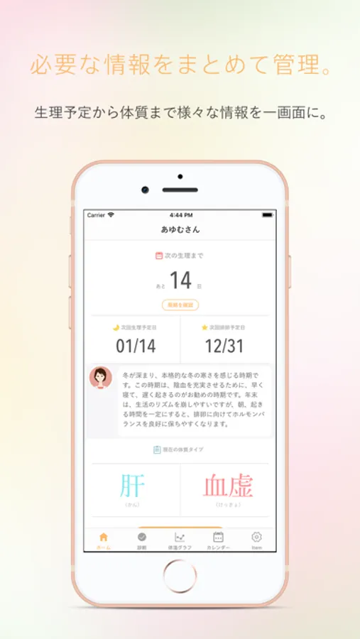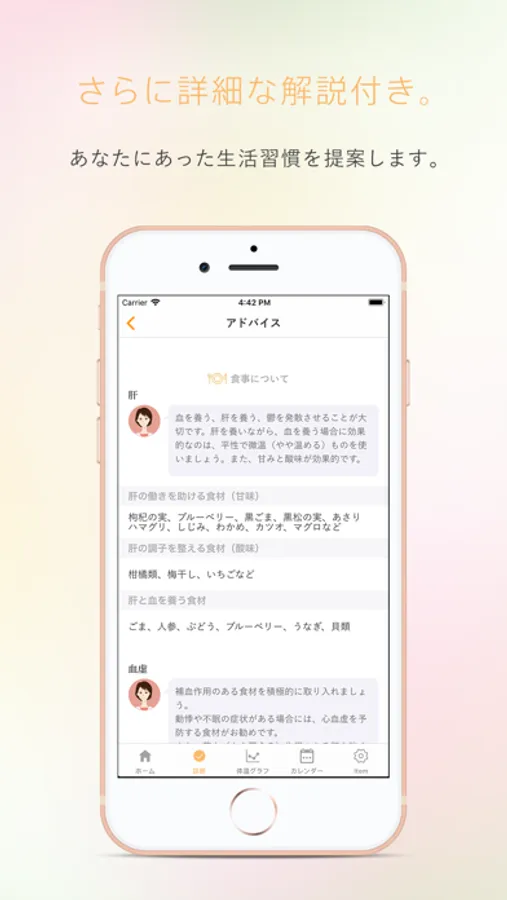 数多くの不妊治療に携わってきた薬剤師・国際中医専門員の監修により、妊娠しやすい体づくりのアドバイスをアプリにしました。東洋医学をベースにひとりひとりの体質にあった食事、運動、睡眠、メンタルケアに関する生活習慣を提案します。