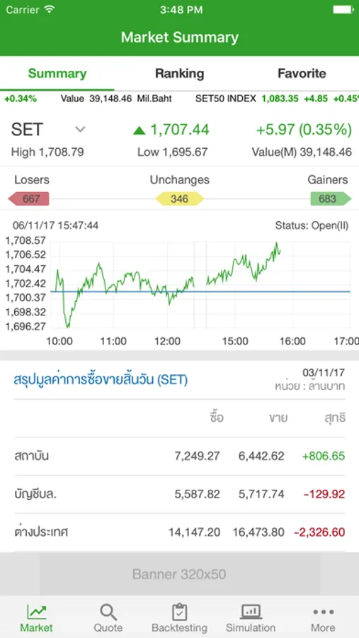 1. Market - To view the SET and TFEX’s market summary, top ranking of stocks, futures/options series and funds including record your favorite list.