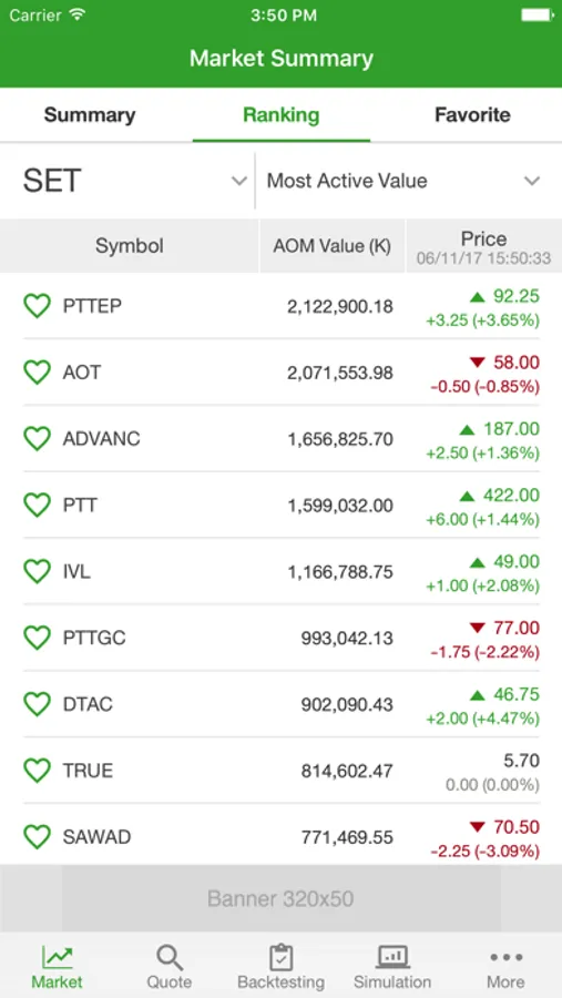 1. Market - ติดตามข้อมูลภาพรวมการซื้อขายหลักทรัพย์และอนุพันธ์ ข้อมูลการจัดลำดับของหลักทรัพย์, อนุพันธ์และกองทุน รวมถึงบันทึกหลักทรัพย์, อนุพันธ์และกองทุน ในรายการ Favorite