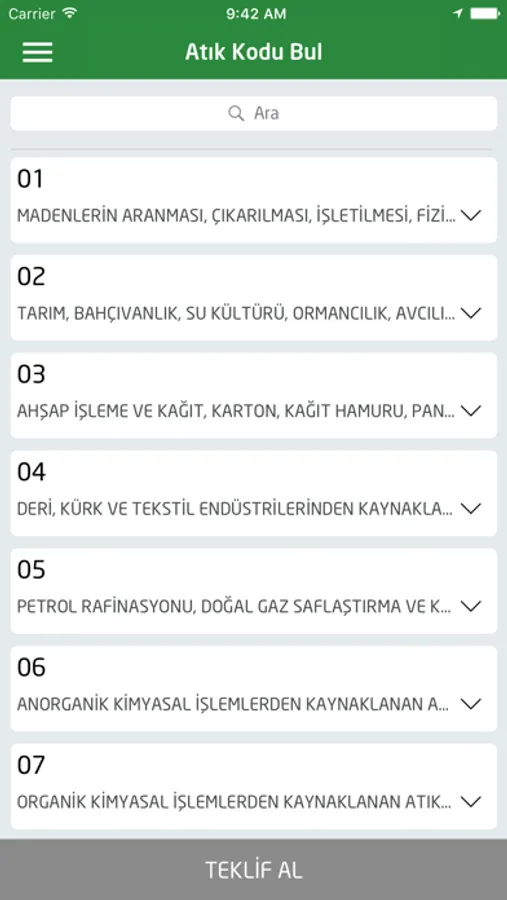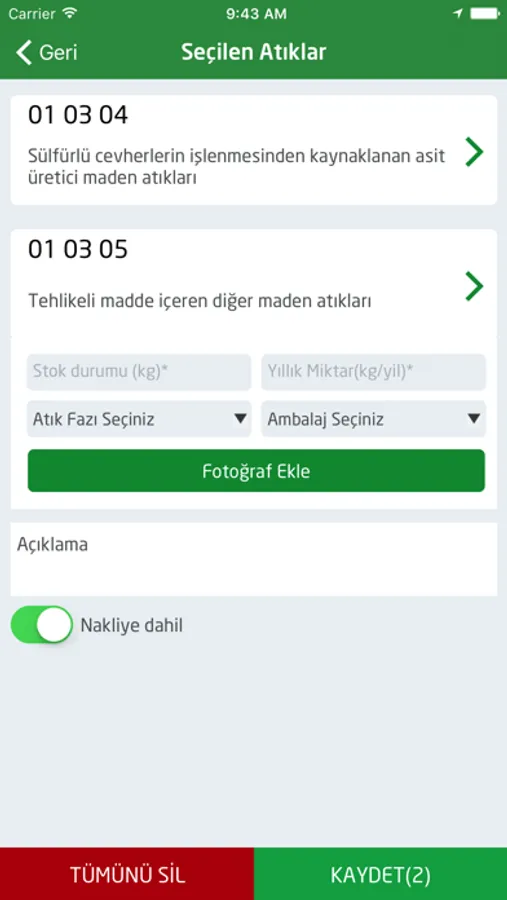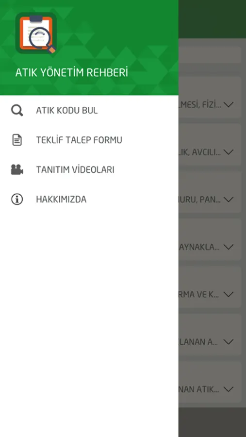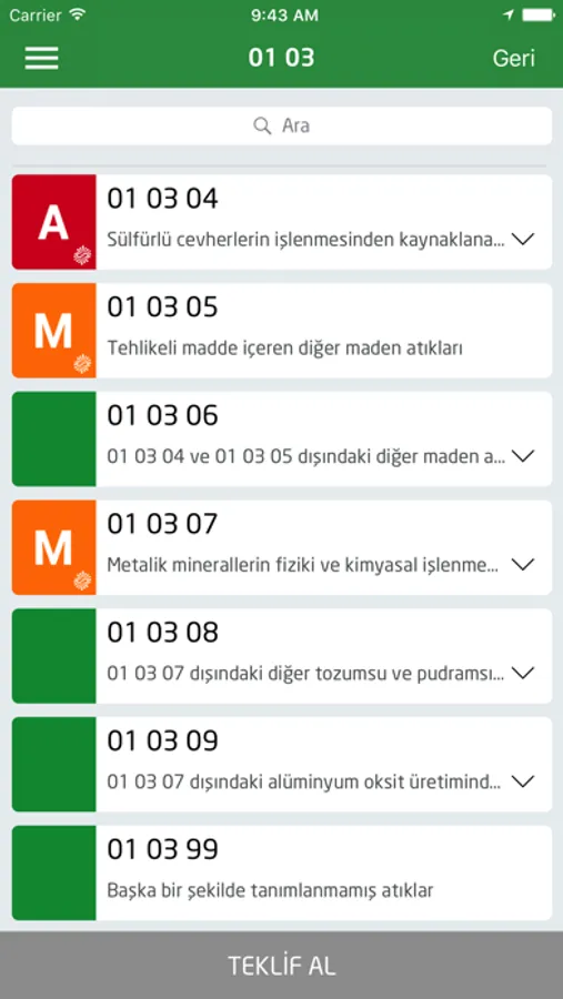 Hizmet verilen atıklar arasından atıklarınızı arayabilir, ilgili kodları seçerek teklif talebinde bulunabilirsiniz. Talep formuna atıklara ait fotoğraf ekleyebilir, atıklarınızın bulunduğu lokasyonu seçebilirsiniz.