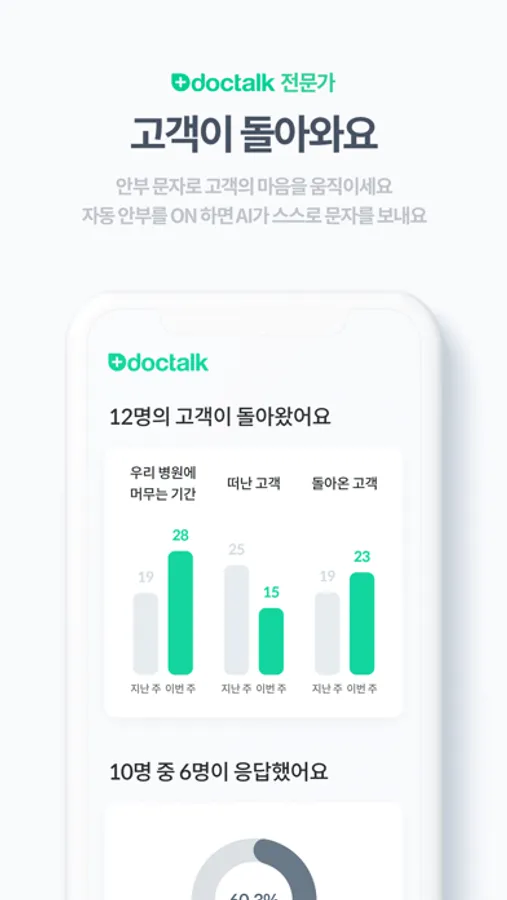 [가장 쉬운 환자 관리(CRM)] 닥톡 환자들과 무료 채팅, 메시징이 가능합니다. 재진 환자 휴대폰 DB를 업로드해 우리나라 최저 비용으로 일반 문자 메시지를 보낼 수 있습니다.