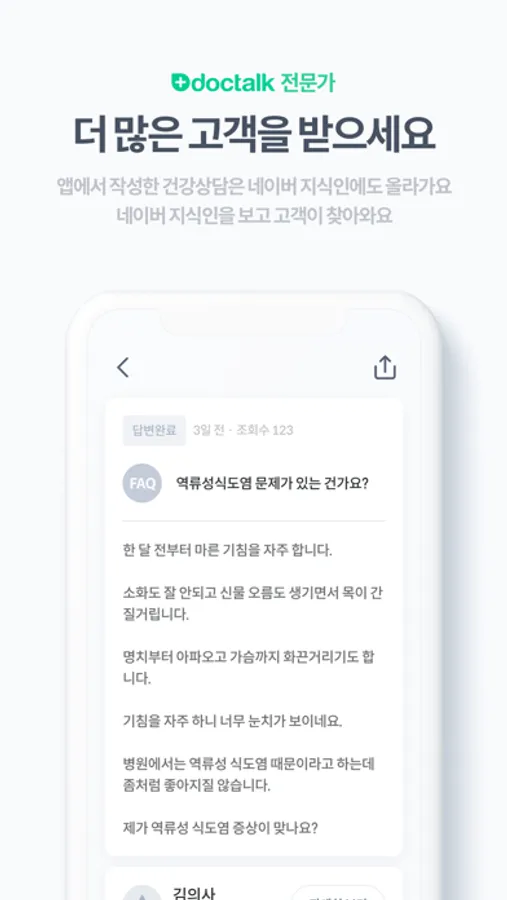원하는 진료과의 여러 닥톡 의사에게 동시에 전달되어 더욱 더 상세하고 구체적인 답변을 받아볼 수 있습니다.