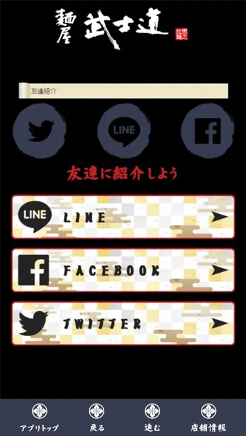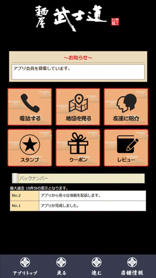 このアプリは、麺屋武士道のお得な情報をお伝えするアプリです。