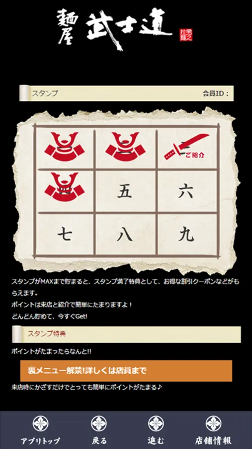 ・麺屋武士道の実店舗で使用するスタンプカードを利用することができます。