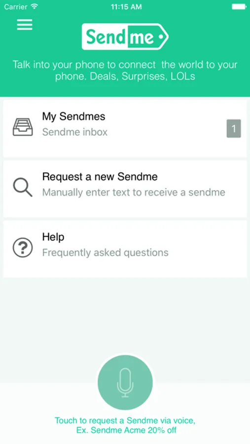 Sendme is about digitally connecting you to messaging and promotions you see outside of your phone. Using voice or text you can receive messages, like information or a special promotion, that you see on a billboard, the web, TV, poster, or other print media.