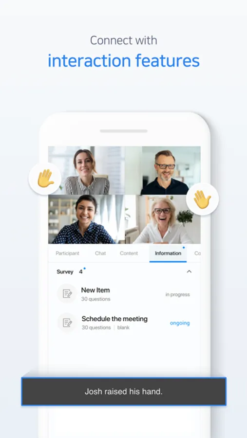 Interaction features, such as “Raise Hand” and “Poll,” make your conferences richer. Through the interaction features, the presenter can see the reactions of other participants in real time. If it is difficult for everyone to present, such as online education or a large seminar, the 'chat' function can be used to share opinions among participants.
