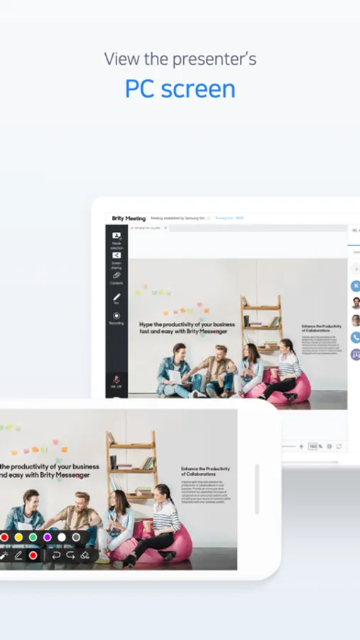 Brity Meeting is a web conferencing service that enables users to communicate and collaborate anytime, anywhere through various devices such as PC and Mobile.With Mobile App, you can easily schedule and manage your Web Conference and easily join the meeting.You can also share voice, video, and documents during meetings, and communicate effectively through features such as annotation and real-time chat.