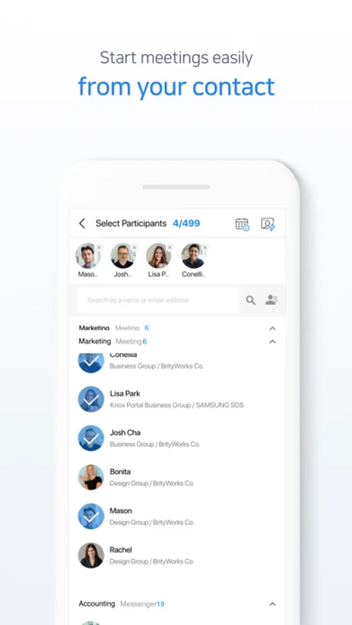 You can start a meeting immediately by selecting participants from Contacts. Once meeting is reserved, an invitation email will be automatically sent to the participants. Also, you can reserve repeated meetings as “Permanent Conference” to reduce repetitive tasks.