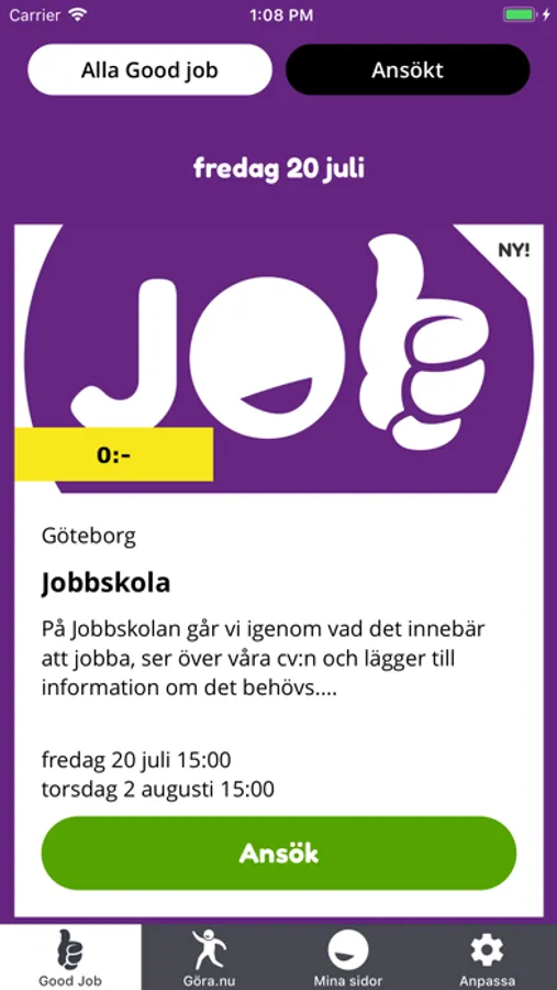 Good Job är till för dig som är över 18 år och vill jobba extra. Du kan lägga in ditt CV och söka jobb i appen. För att kunna söka jobb genom Good Job behöver du gå en Jobbskola, ansök till den i appen.