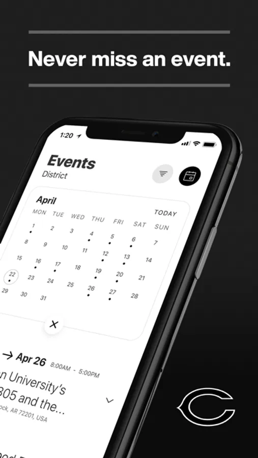 The event section shows a list of events throughout the district. Users can add an event to your calendar to share the event with friends and family with one tap.