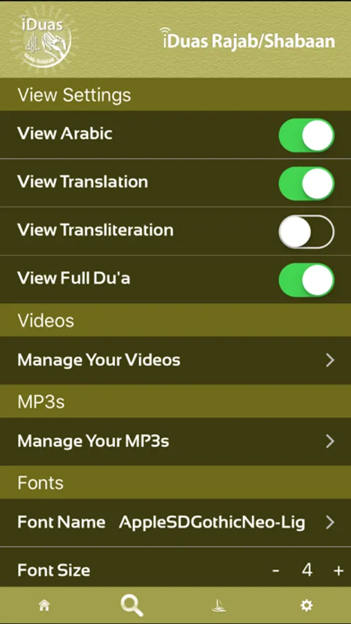 - Can customize the app using the settings (i.e. View Arabic, Transliteration, font size, and more)