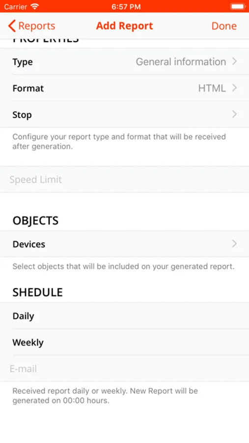 · Historia y Informes - Preview o descargar informes. Puede incluir diversa información: horas de conducción, puentes, distancia recorrida, consumo de combustible, etc.