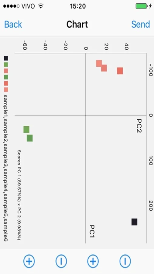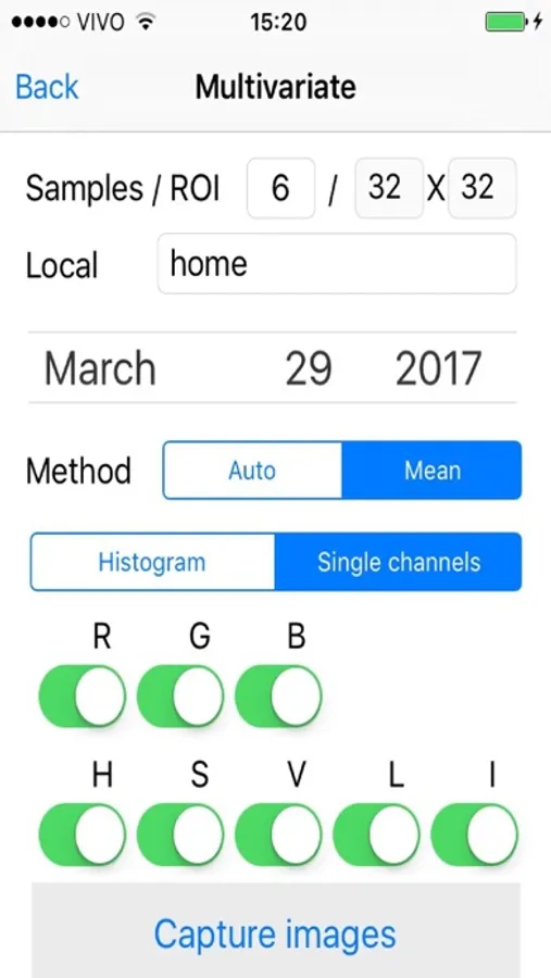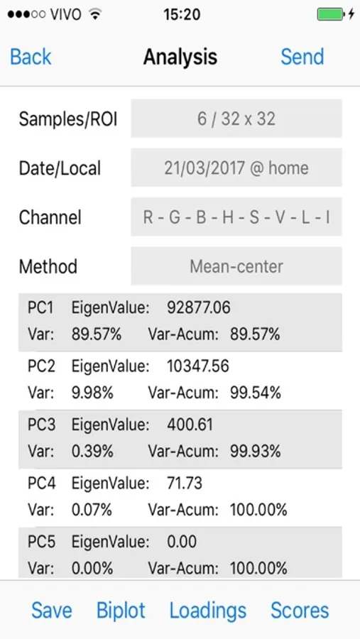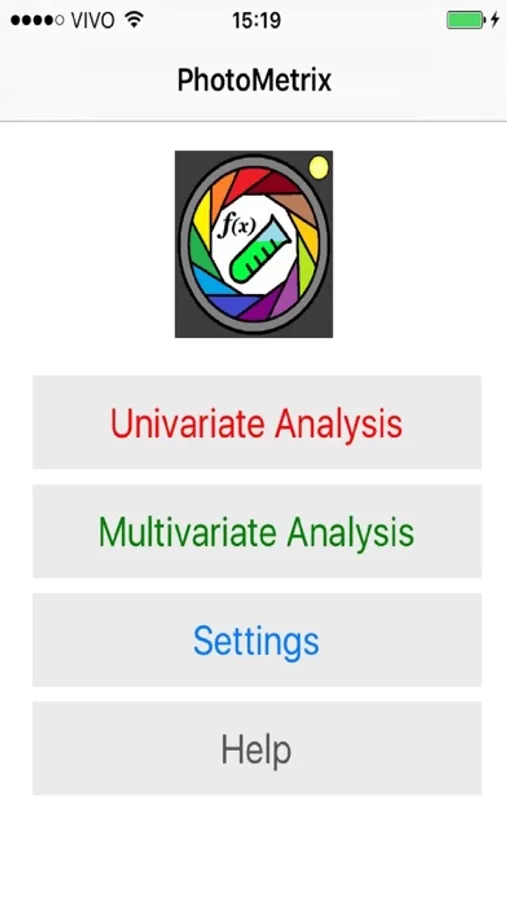 This app employs Single Linear Correlation technics for univariate analysis and Principal Component Analysis (PCA) for multivariate exploratory analysis. The image data are acquired using the device main camera and converted in RGB histograms. In addition, apart color channels of RGB, HSV, HSL and HSI systems are used during the univariate and multivariate processes. It is possible to send by e-mail the image data, analysis data and charts. In order to validate the obtained results, the same sets of data were tested using Microsoft Excel© and ChemoStat©. The results in both applications coincided in various combinations.
