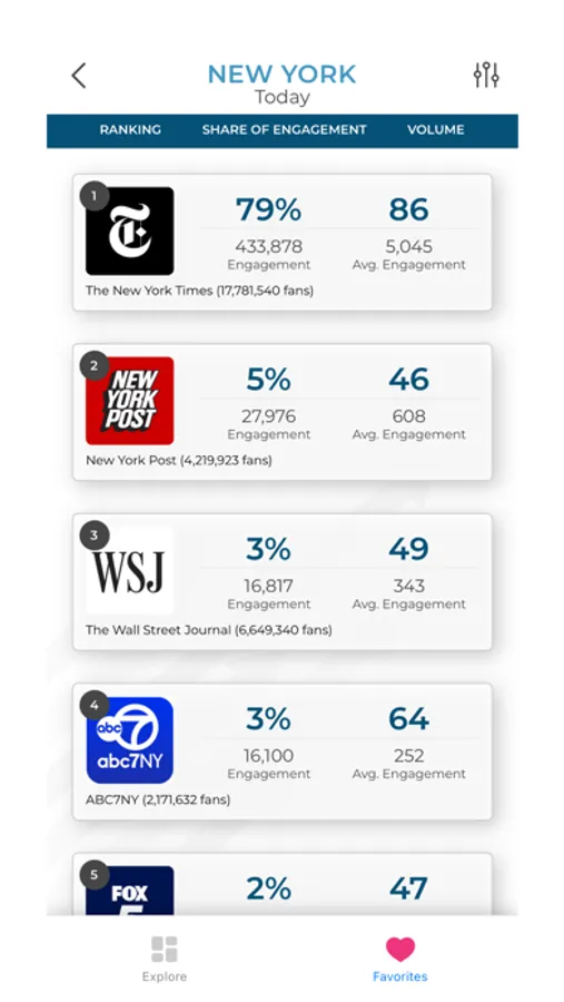 Social Rankings is the free daily social media scoreboard for newsrooms. Use Social Rankings to track a daily updated social ranking report of the top performing news organizations, talent and content in each of 200+ markets. Social Rankings allows you to see which stations are winning and which are losing. Analyze which posts garnered the most engagement both locally and nationally using Social Rankings top content report.
