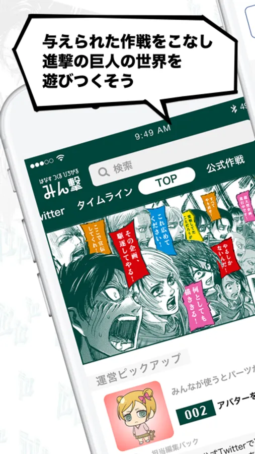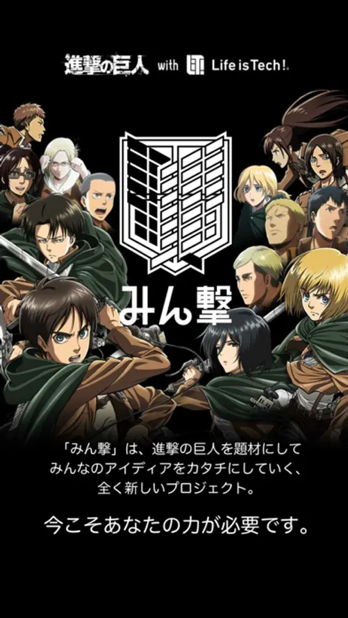 「みん撃」は、『進撃の巨人』が好きな人にもっと楽しんでもらい、 まだ『進撃の巨人』を知らない人にも好きになってもらうための ユーザー参加型のアプリです。